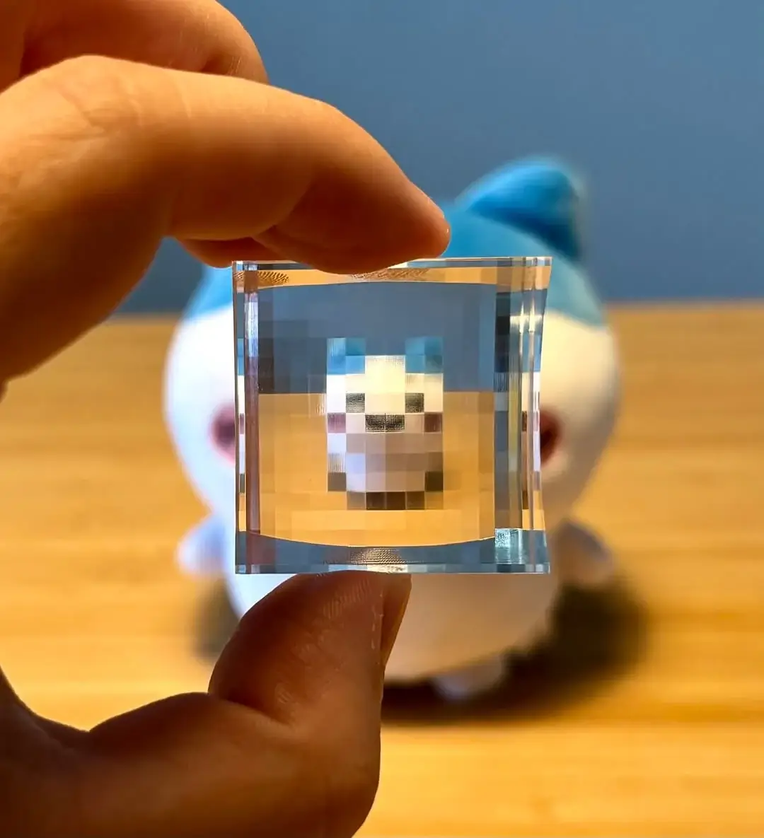 The cube, made from carefully crafted crystal, uses its unique refractive properties to break down images into blocky, pixel-like patterns. When an object or scene is viewed through the cube, it appears as though its resolution has been drastically lowered, offering a playful and thought-provoking visual experience.