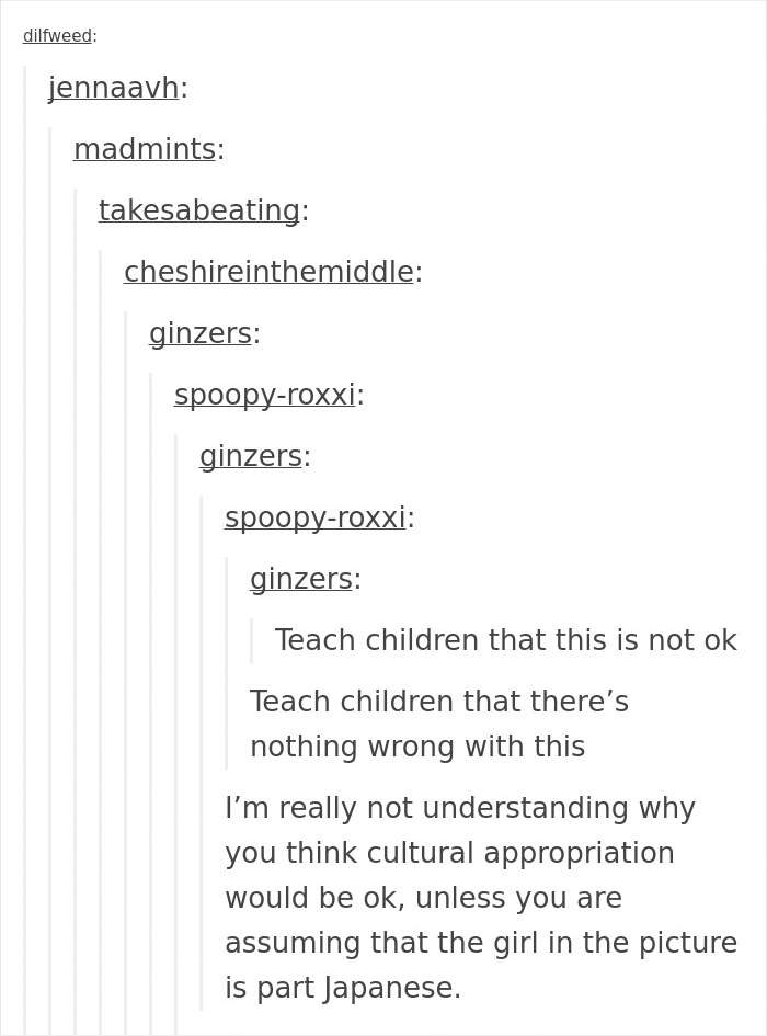 The mom in question, who runs a party planning blog called The Gala Gals, is just one of the latest people to enter the fierce modern debate on cultural appropriation, and when it is and isn’t okay. Do you dress up as people from other countries in order to make fun of them? You’re probably a racist. Do you like wearing a kimono because you appreciate its beauty and historical significance to Japan? Go right ahead. A strong argument can be made, after all, that stigmatizing the sharing of cultural elements only creates more distance between us.