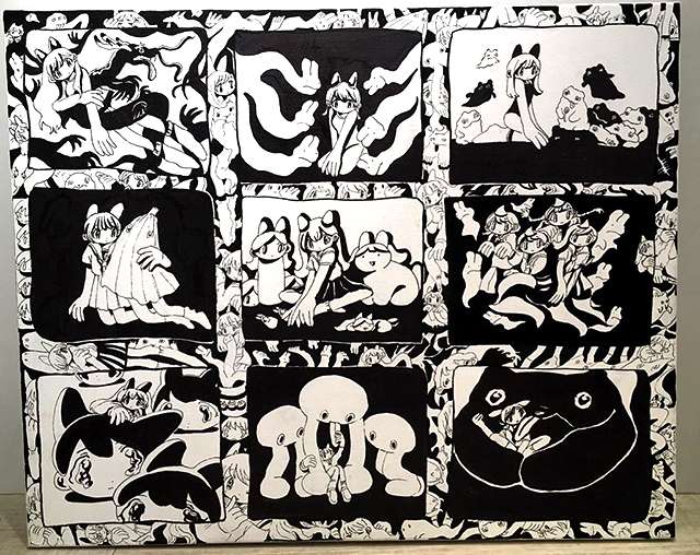 If the girls in the drawings of Kaechang with their long limbs, large hands, and their tiny heads and large eyes make you think of Osamu Tezuka’s artwork, it’s because they were her source of inspiration as she started drawing in her youth. She also performs live painting and designs clothing for CDs, T-shirts, CDs, and stickers alongside her drawings.