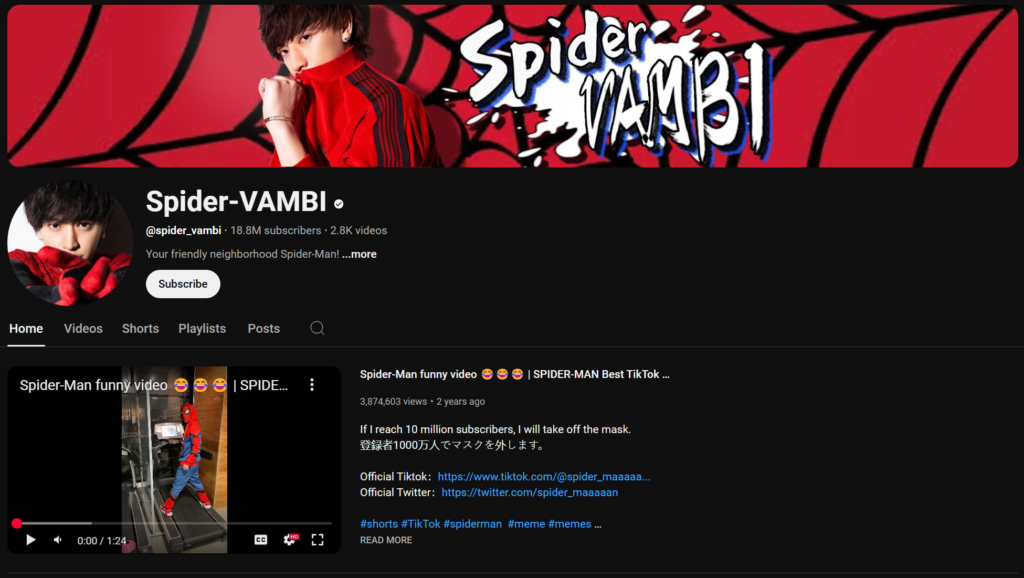 Spider-VAMBI swings through Shorts in a Spider-Man suit, using mime to deliver language-free laughs. Unmasked in 2023 as Vanbi (ex-Vanyun member) after hitting 10M subs, his reveal video topped 30M views. A 2025 TikTok trend he sparked—“Spidey Shimmy”—went viral globally, per ByteDance stats. His silent style’s a universal win.